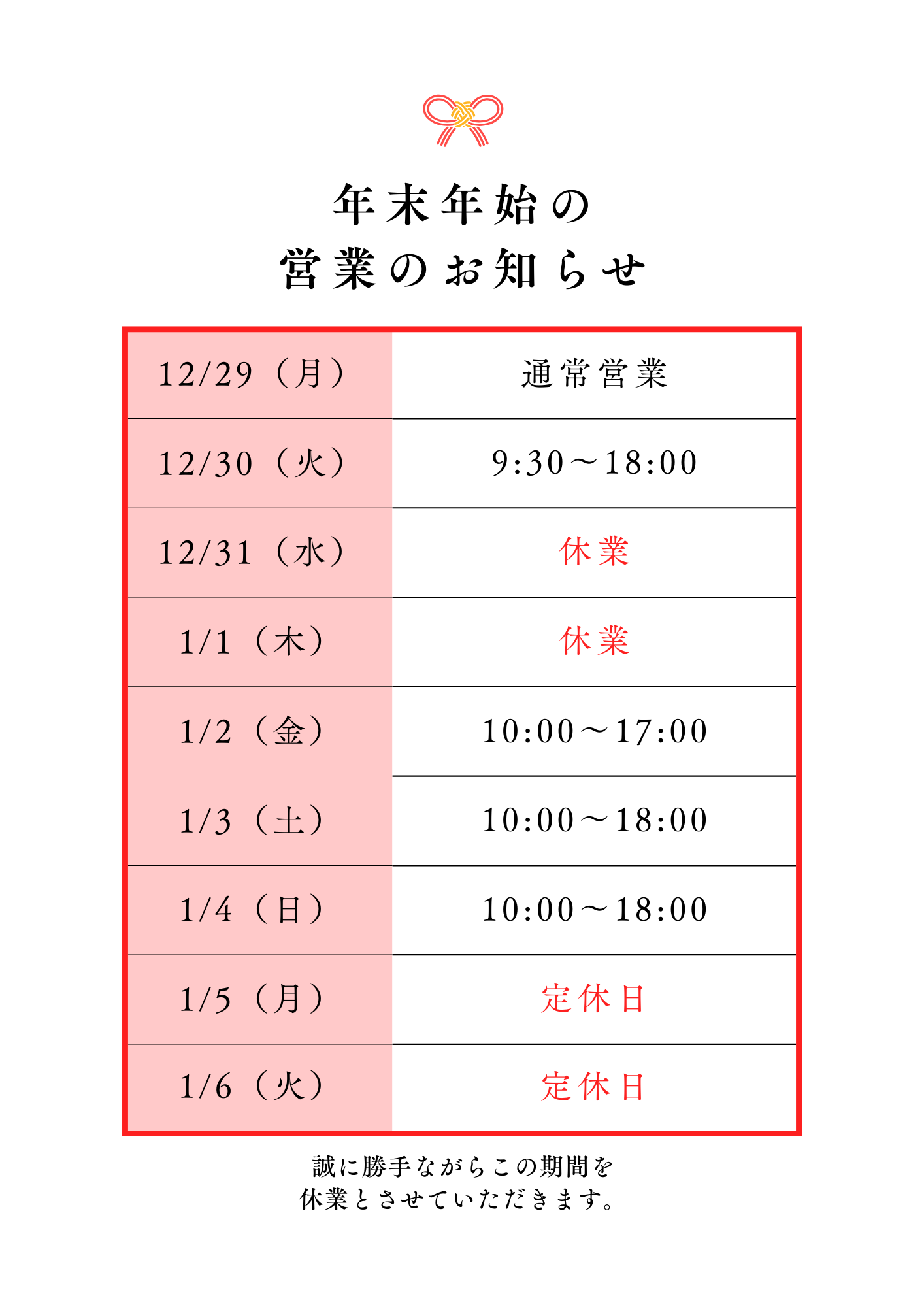 定休日のお知らせ